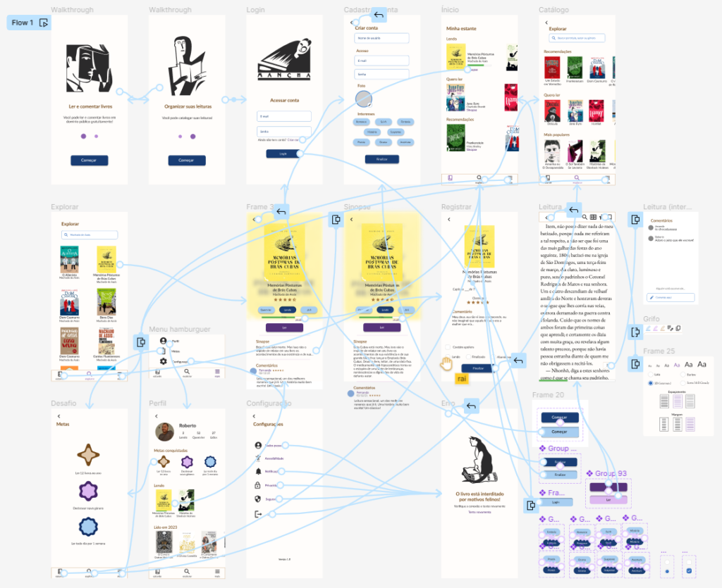Nesse momento foi quando delimitei que o produto digital a ser prototipado seria um aplicativo para celular para catalogar e ler de forma colaborativa livros de domínio público. A escolha disso se deu porque a maior parte das pessoas entrevistadas acessa conteúdos sobre leitura pelo celular, gostam de catalogar e, de alguma forma, discutir literatura. Tornar o foco em livros de domínio público implica que não precisa haver compras no aplicativo, nem usar da pirataria para que o aplicativo aconteça.